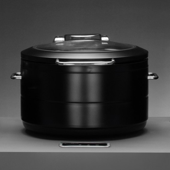 Podgrzewacz gastronomiczny De Luxe Black to połączenie solidnej konstrukcji, nowoczesnego designu i praktycznych rozwiązań. W całości utrzymany w eleganckiej, czarnej kolorystyce z ramą ze stali nierdzewnej, doskonale sprawdzi się w nowoczesnych hotelach i restauracjach.